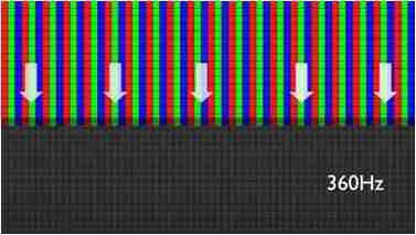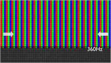 传统液晶驱动是从左到右单向进行,,,,在画面更新速度愈来越愈快的情况下,,,位于驱动线路末端的右下角区域,,画素的闸极来不及在短时间内获得足够电压,,,无法显示出正确的颜色资讯。。。。 |
