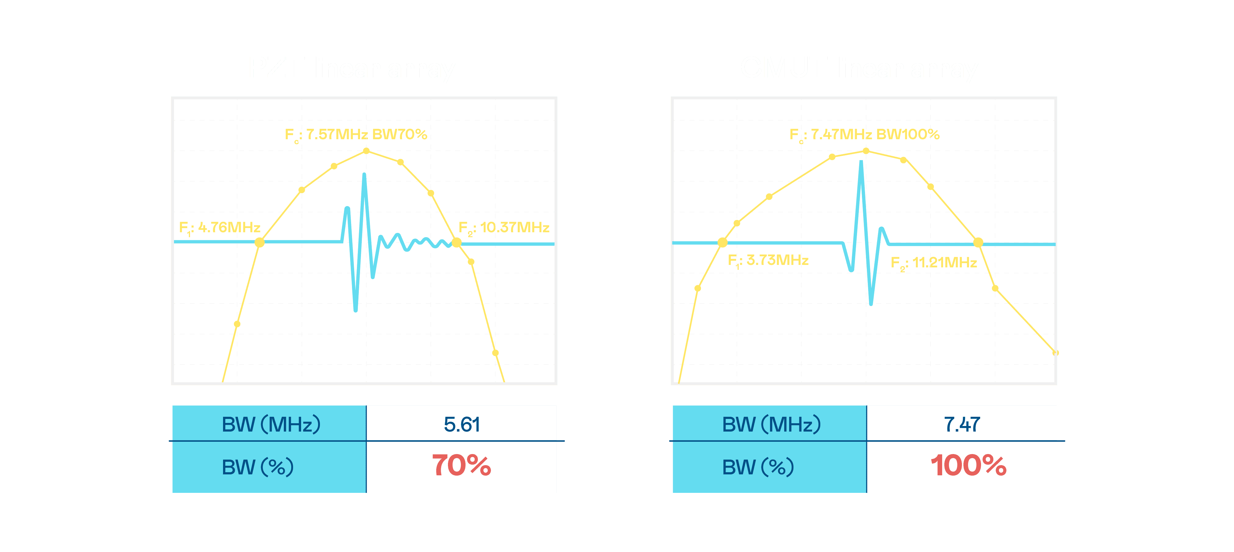 超音波影像的解析度高低,,,,首先取决于探头能发出的讯号频宽。。森林舞会 CMUT 可提供高清晰的超音波讯号,,,提供高频宽、、、高灵敏度、、、影像纹理细节更高的超音波影像,,,,协助医护人员缩短影像判读时间及利用精准的医疗影像进行诊断。。